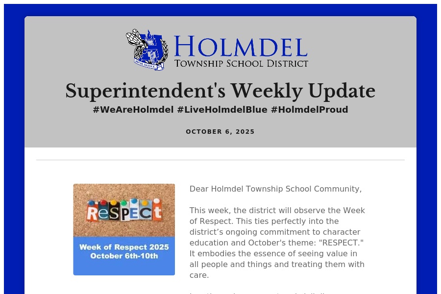Superintendent's Weekly Update #WeAreHolmdel #LiveHolmdelBlue #HolmdelProud October 20, 2025 Dear Families and Staff, I hope this message . . .