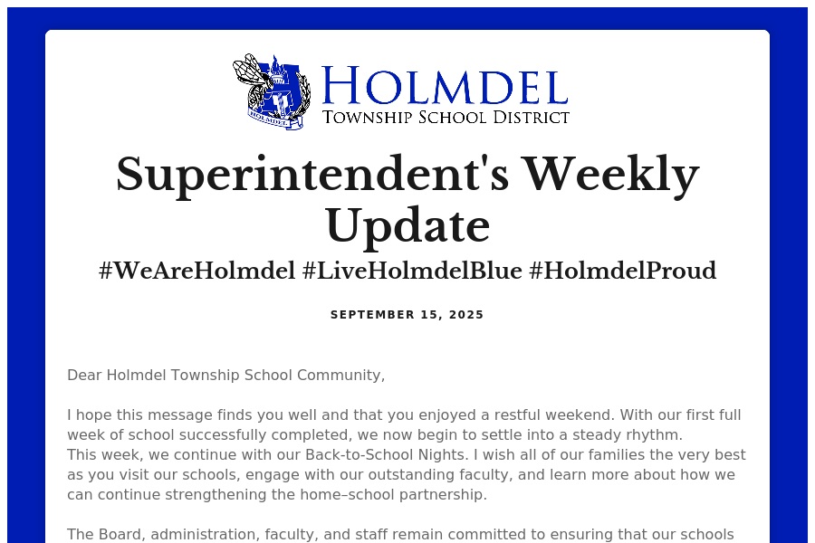 Superintendent's Weekly Update #WeAreHolmdel #LiveHolmdelBlue #HolmdelProud September 15, 2025 Dear Holmdel Township School Community, I hope this message. . .
